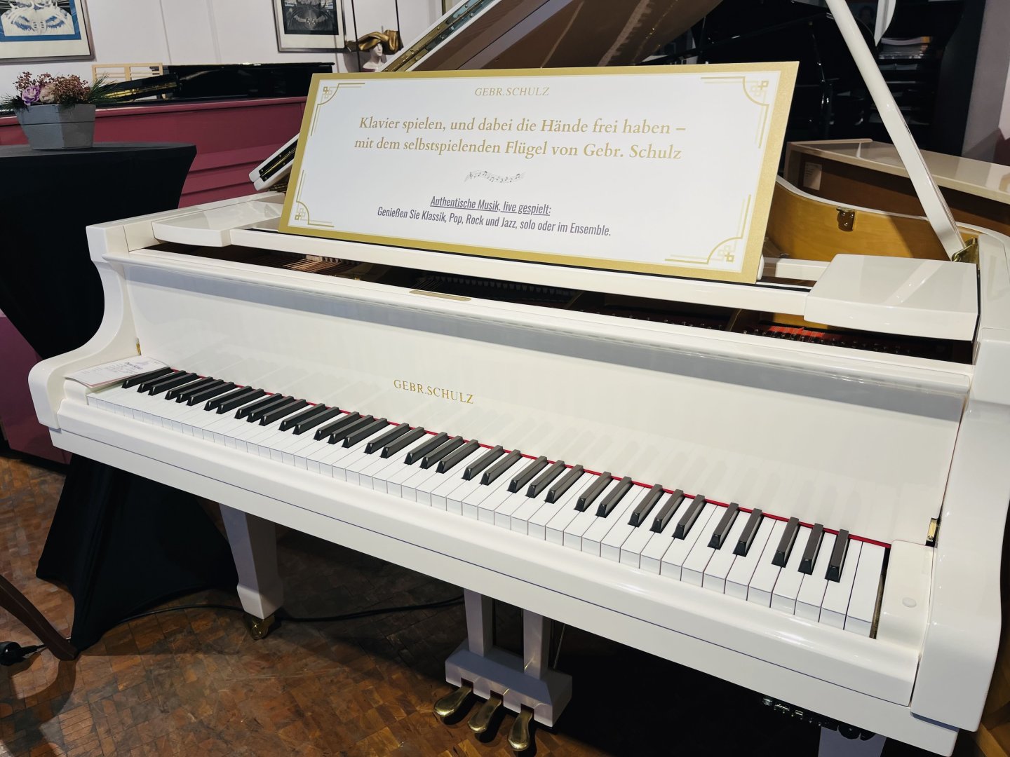 Dieser exklusiv weiß polierte, selbstspielende Flügel von Gebr. Schulz verbindet klassische Handwerkskunst mit modernster Technologie und bringt so ein außergewöhnliches Musikerlebnis in jeden Raum. Das hochwertige Selbstspielsystem ermöglicht es Ihnen, aus einer Vielzahl professionell eingespielter Musikstücke zu wählen und jederzeit beeindruckende Klaviermusik zu genießen – ganz ohne eigenes Spielen. Optisch überzeugt der Flügel durch seine elegante, strahlend weiße Hochglanzoberfläche, die jedem Ambiente eine besondere Note von Stil und Klasse verleiht. Ob für das private Wohnzimmer, repräsentative Räume, Gastronomie, Hotels oder Events: Dieser Flügel ist nicht nur ein musikalischer Genuss, sondern auch ein edles Designobjekt, das Atmosphäre schafft und höchsten Ansprüchen gerecht wird.