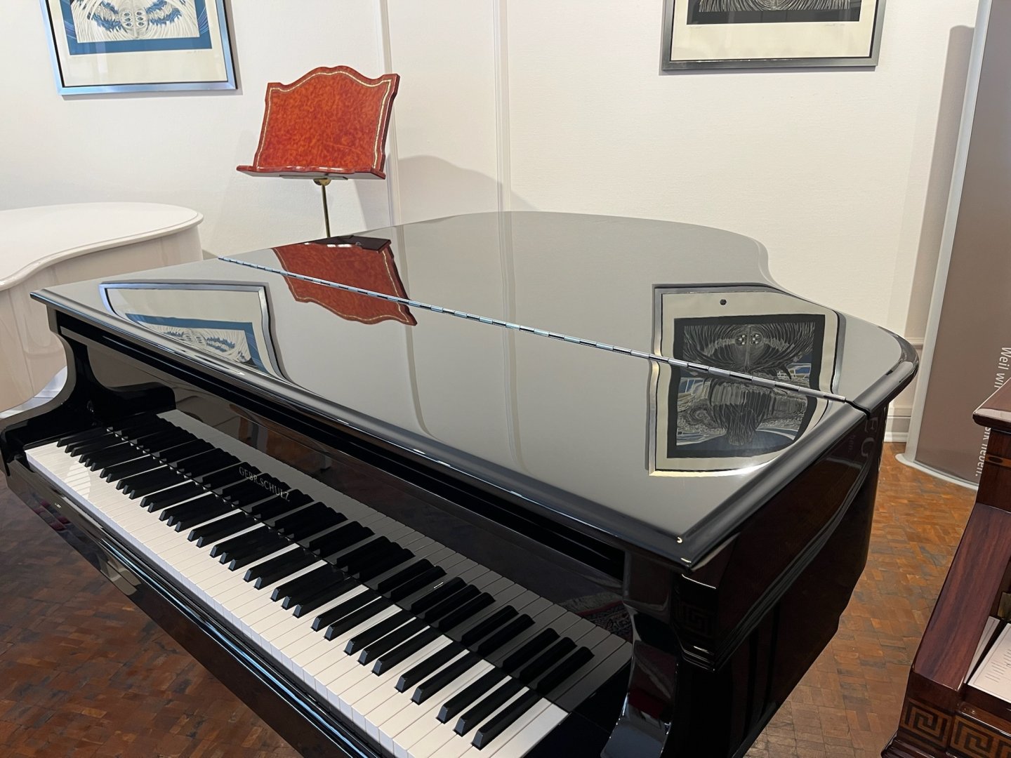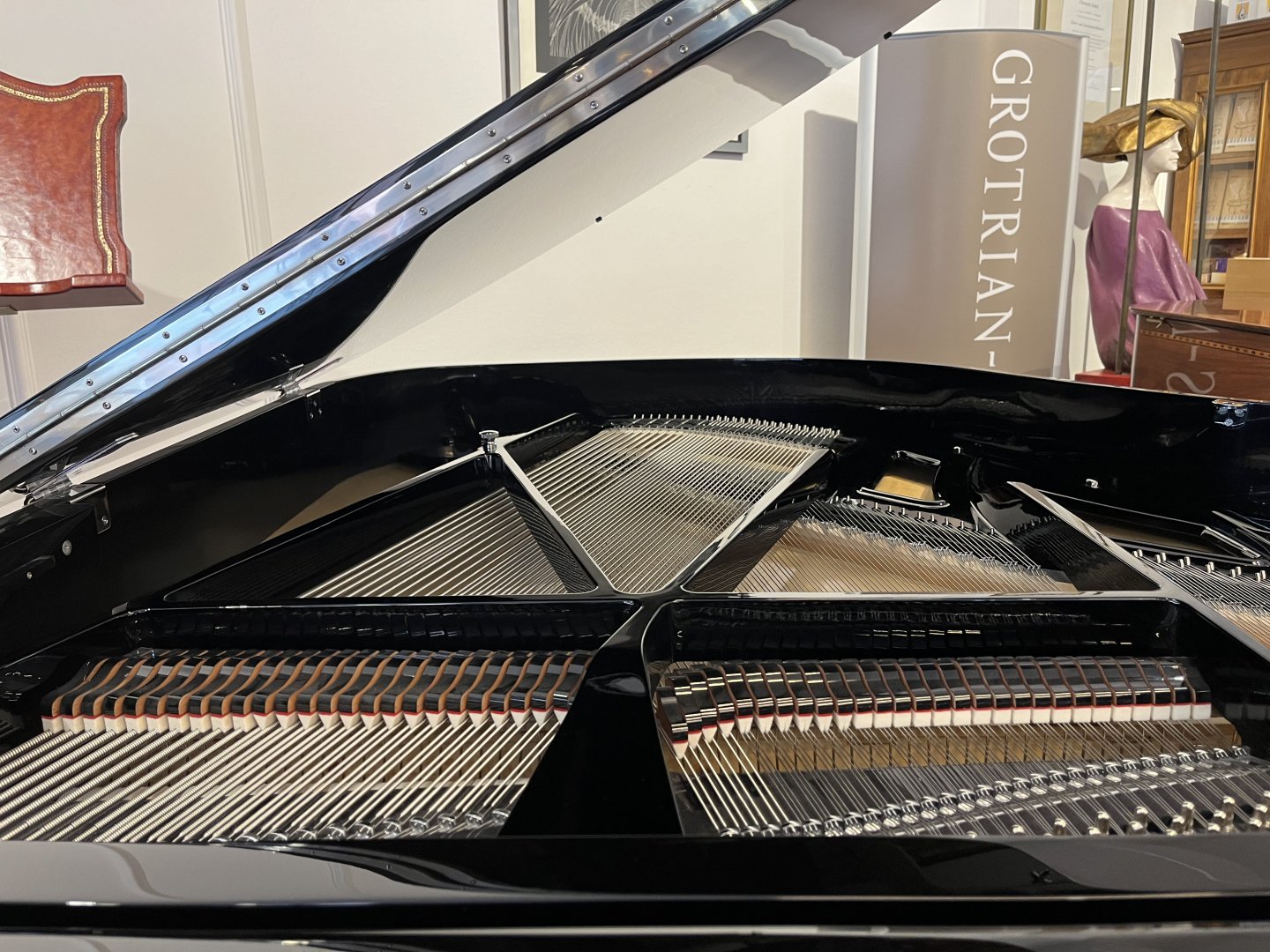 Neuer Flügel mit schwarz lackiertem Gussrahmen und Chrom-Ausstattung. Die Eisenumspinnung der Saiten verleiht dem Flügel nicht nur ein außergewöhnliches Design, sondern auch einen besonders kernigen Klang.