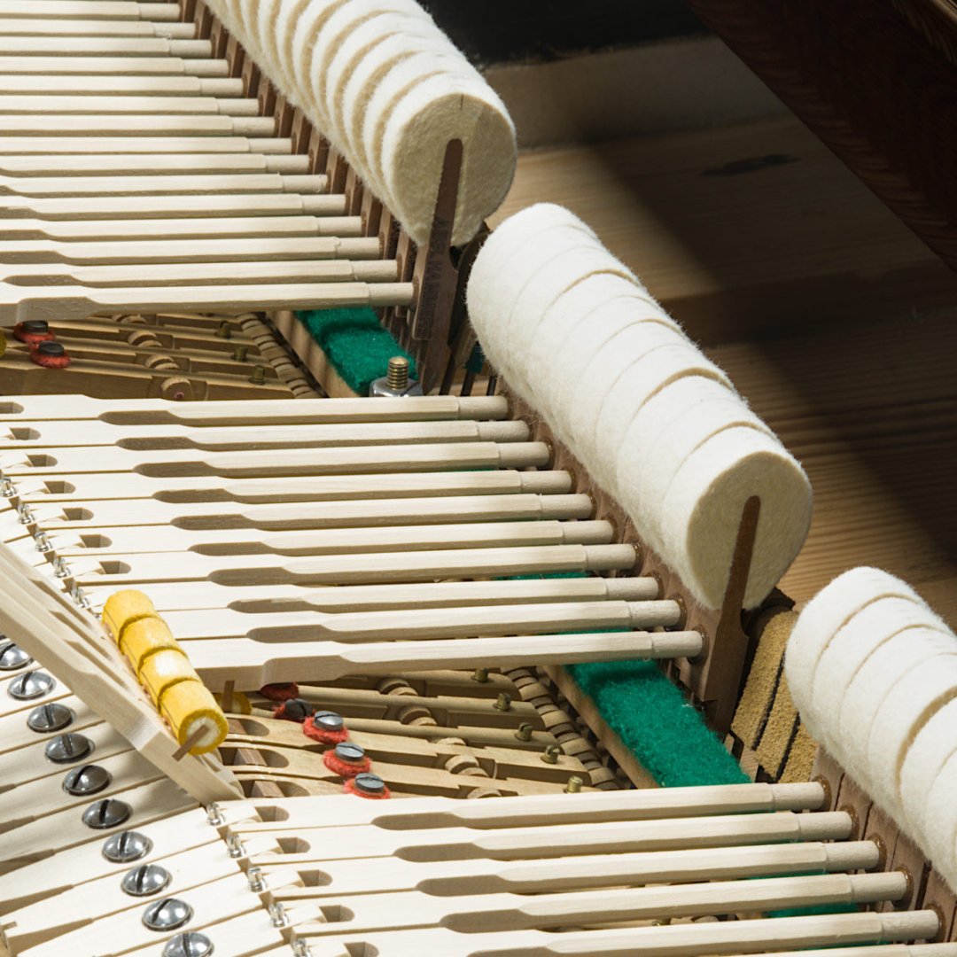 neue Saiten, neue Stimmwirbel, neue Filze, neue Hammerköpfe, alle Filze und Leder in der Mechanik uvm. sind neu, daher klappert nichts und die Mechanik spielt sich wie bei einem neuen Instrument.
